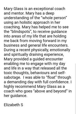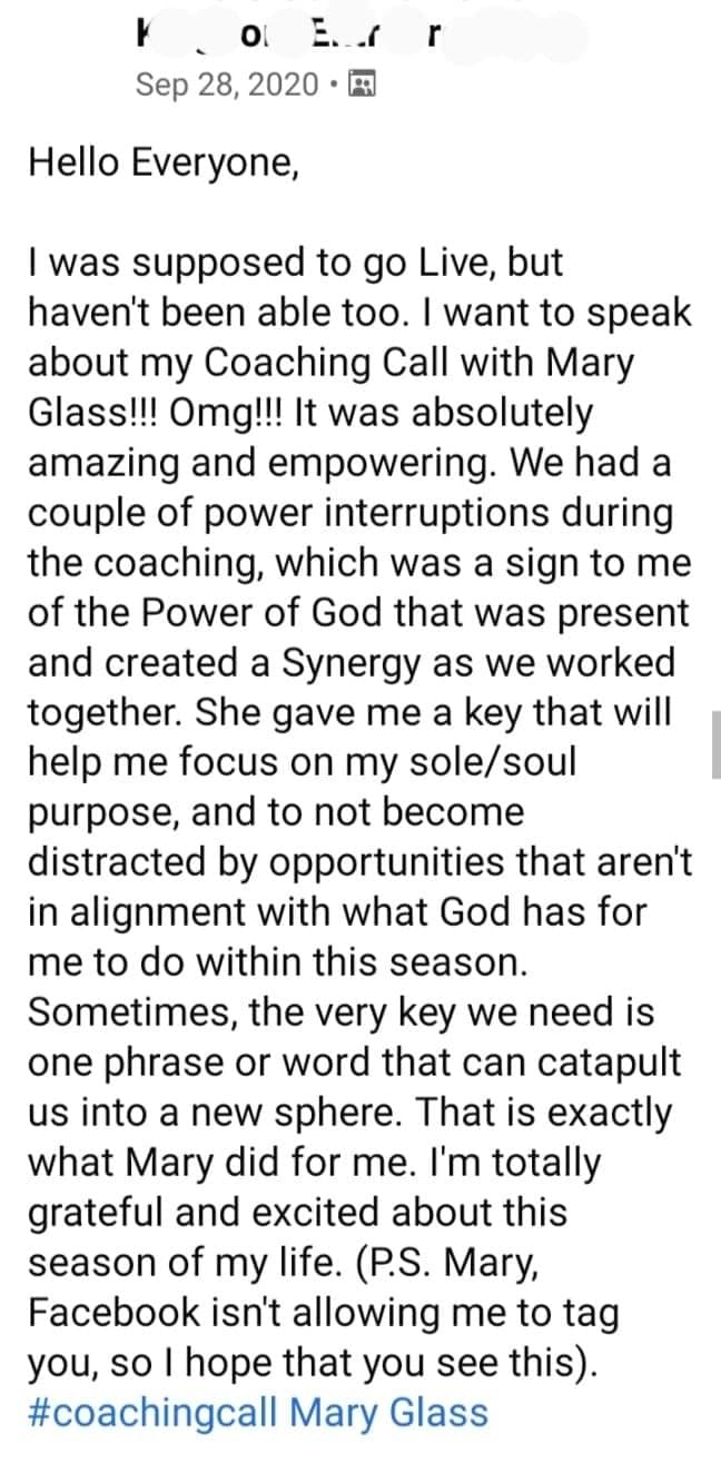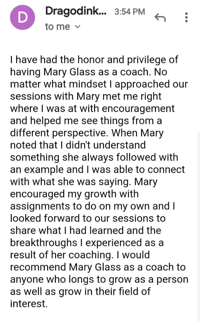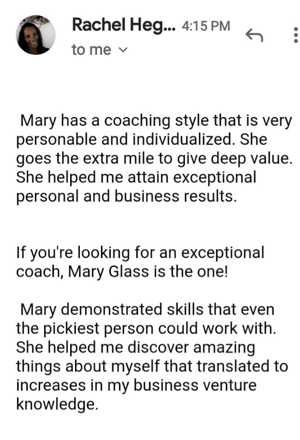 Hi, I'm Mary Glass, Your Intuitive Certified Coach, Consultant, Heartset & Mindset Reset Partner, Personal Mighty Advocate for Your Greatness, and Soul Success CEO.  In partnership with the Holy Spirit and throughout my life, I have walked myself and alongside many others through major painful and stressful experiences that have led to  physical, mental, emotional, and spiritual breakthrough, release, peace, joy and growth. I have also broken through a frustrating, self-sabotaging pattern of hiding and dimming down  my full unique combination of talents, personality, passions, experience and training; and have  stepped into my deepest purpose and passion.